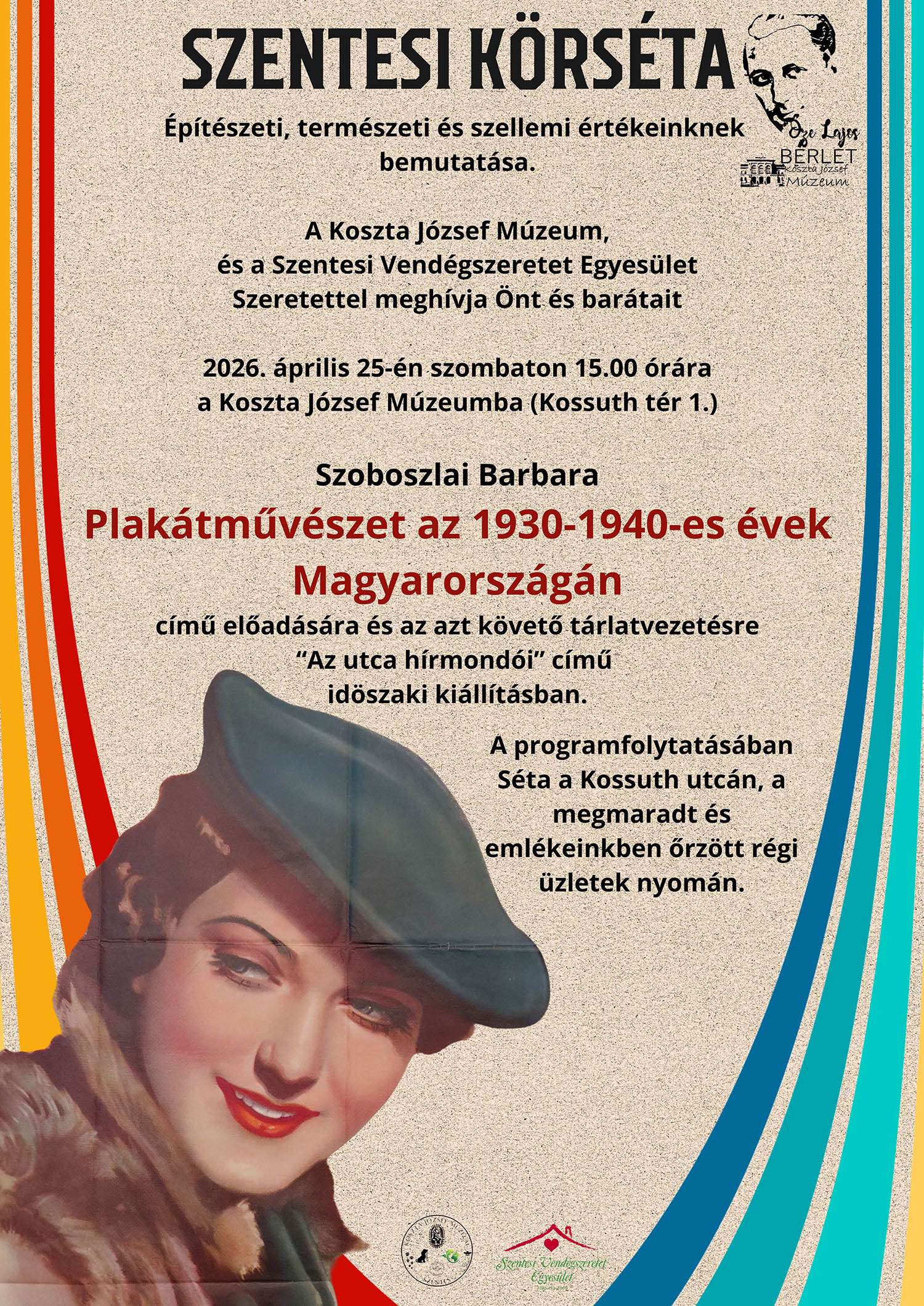2026. április 25-én, szombaton 15 órai kezdettel a Koszta József Múzeumban (Szentes, Kossuth tér 1.) Szoboszlai Barbara tart előadást a XX. század első felének plakát művészetéről. Ezt követően „Az utca hírmondói” című időszaki kiállítást tekinthetik meg a résztvevők.