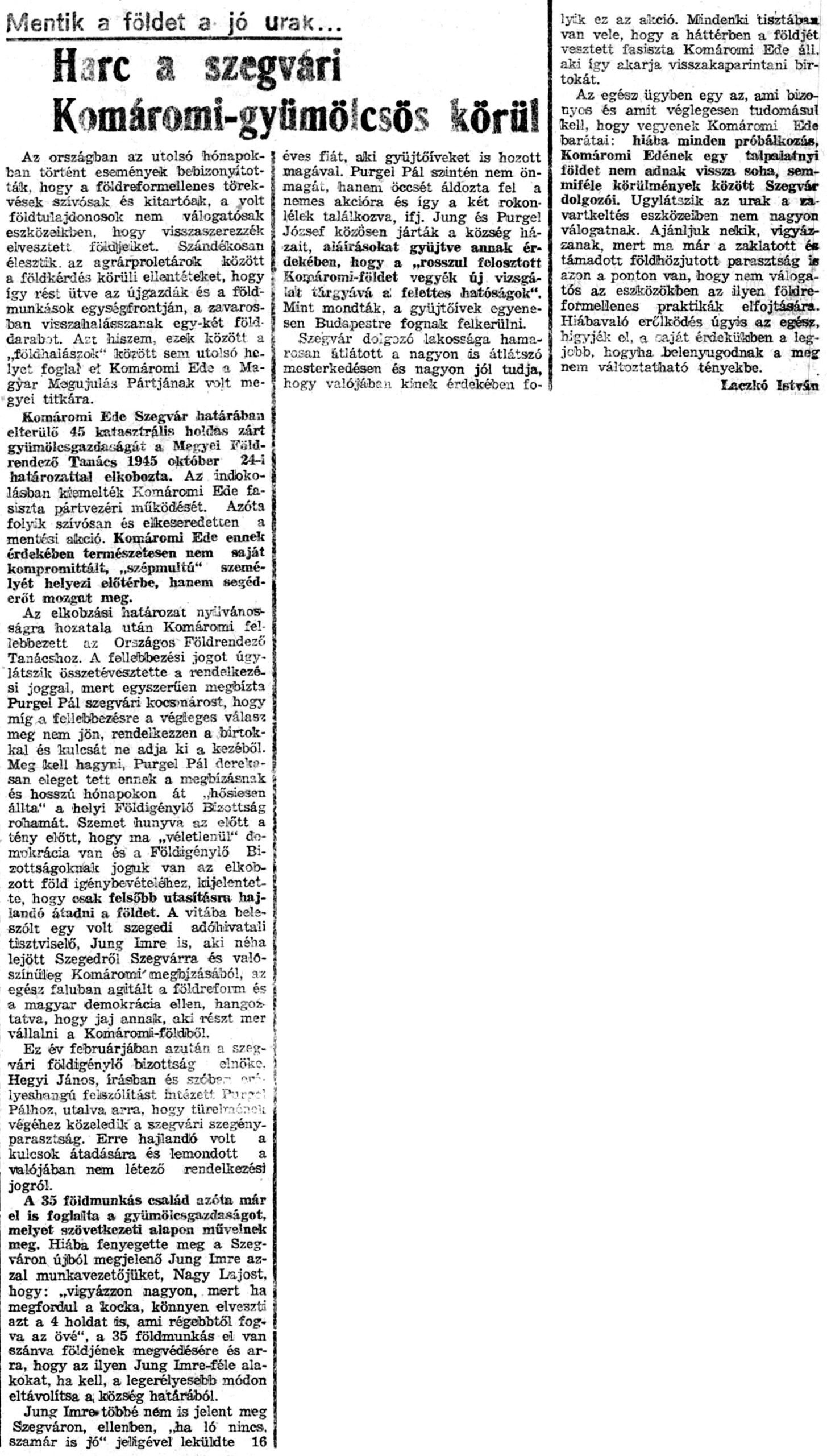 Archív lapszemle, kereken 80 évvel ezelőttről… Egy érdekes (és meglehetősen egyoldalú) cikkre bukkantam a Magyar Alföld újság 1946. március 7-i lapszámában, amelyben Komáromi Ede 45 holdas gyümölcsöskertjéről esik szó, s a cikkben meg van említve az én nagypapám (Purgel József) és az ő testvére, Purgel Pál kocsmáros.