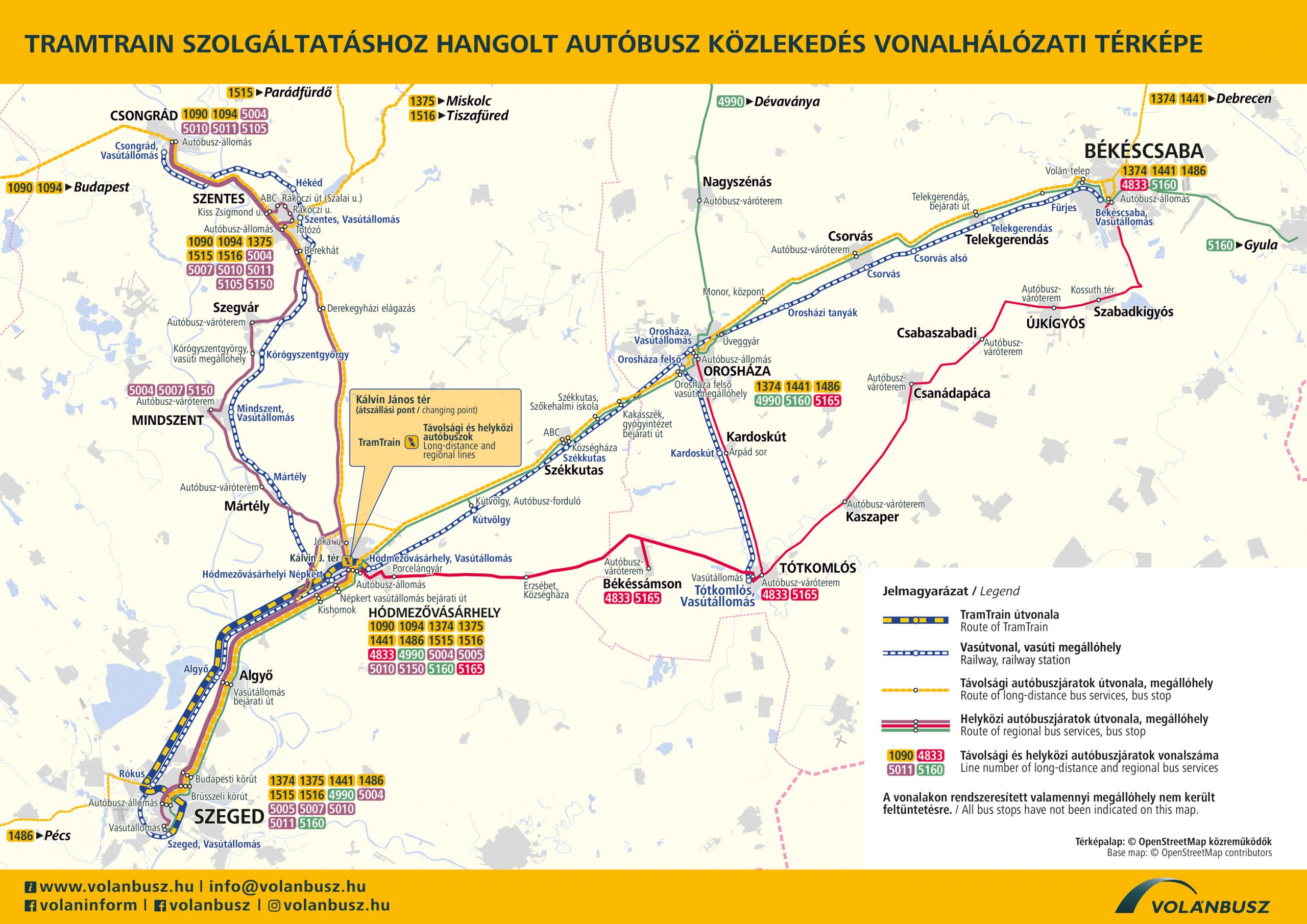 A Volánbusz Zrt. közleménye szerint a Szeged és Hódmezővásárhely közötti, 30 percenként induló TramTrain szolgáltatással összefüggésben, 2022. október 29-től új menetrend szerint közlekednek az autóbuszjáratok számos autóbuszvonalon Csongrád-Csanád és Békés megyékben.