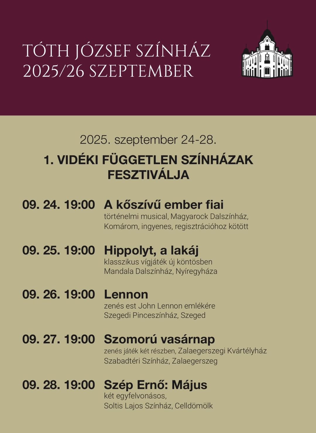2025/2026-os évadot különleges eseménnyel nyitja meg a Tóth József Színház Szentesen: a teátrum ad otthont az első alkalommal megrendezett Vidéki Független Színházi Szövetség Fesztiválnak.
