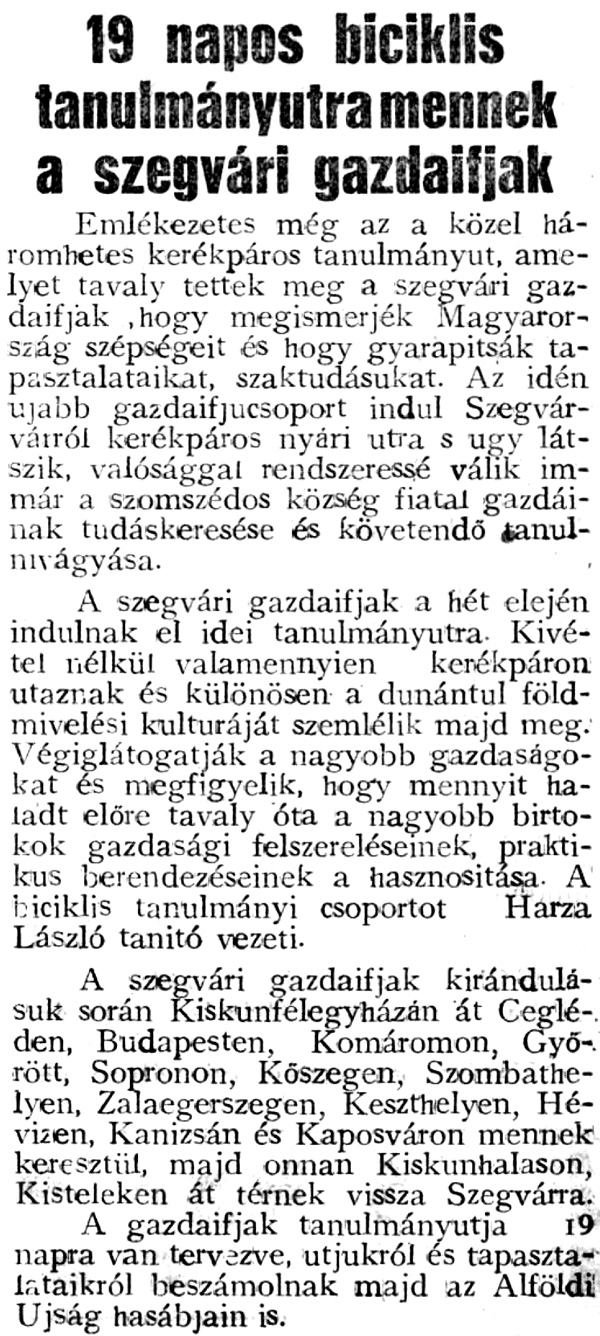 A Szegvári Első Tanyai Gazdakör ifjúsági osztályának tagjai Harza László tanító vezetésével háromhetes tanulmányútra indultak 1937 augusztusában, főként a dunántúli gazdasági élet tanulmányozására.