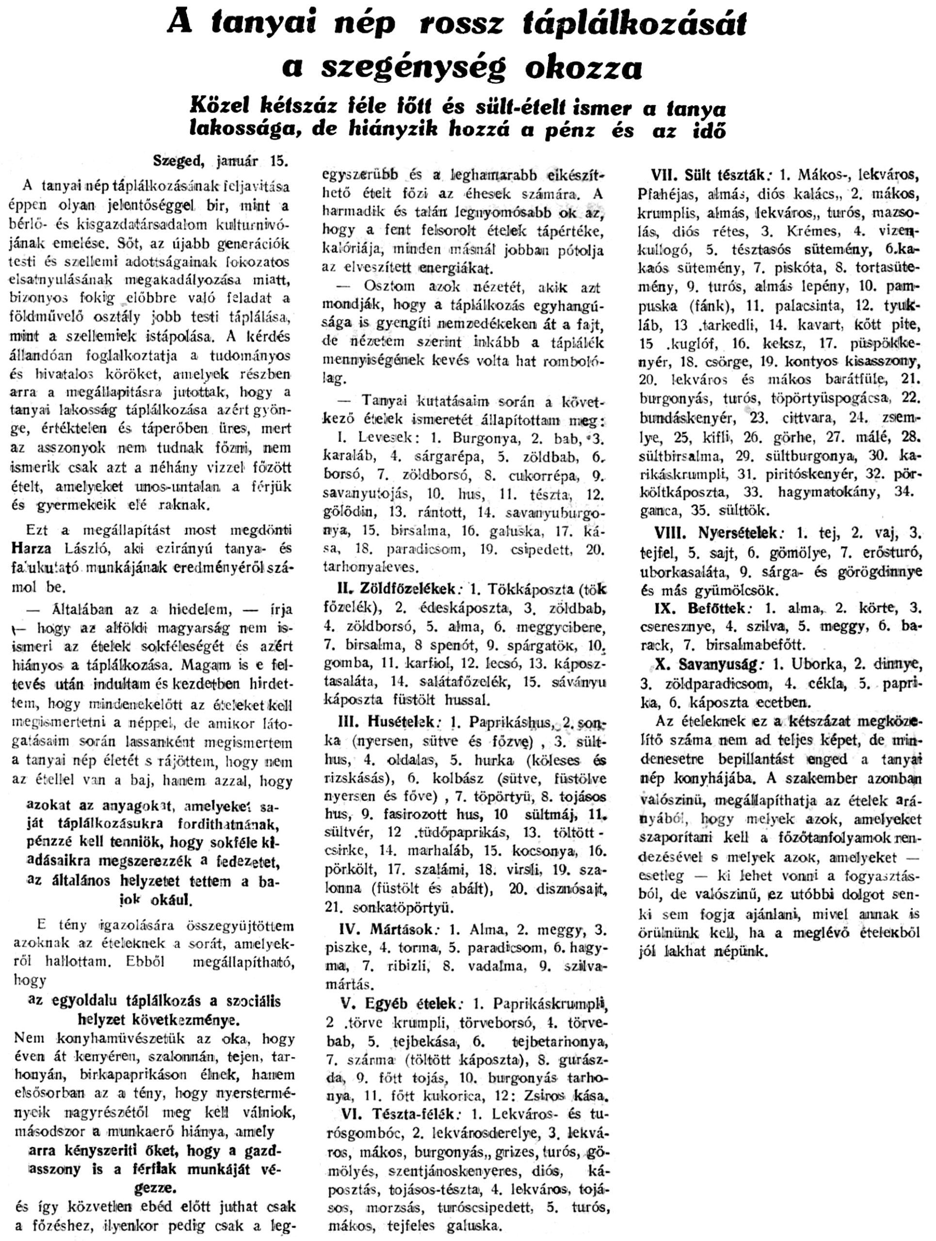 „— Általában az a hiedelem — írja Harza —, hogy az alföldi magyarság nem is ismeri az ételek sokféleségét és azért hiányos a táplálkozása. Magam is e feltevés útján indultam és kezdetben hirdettem is ezt. De ez nem áll.A tanyai nép azért nem táplálkozik jól (sokszor a gyerekek is éhesek maradnak), mert el kell adniok a föld termékeit. Bizony jó kenyérből sincs elég néha. Pláne nem igaz az, hogy ne ismernék a tésztákat. Tanyai kutatásaim során megállapítottam, hogy a következő tésztaféléket ismerik és ennek is, ha volna elég lisztjük és egyéb hozzávalójuk: