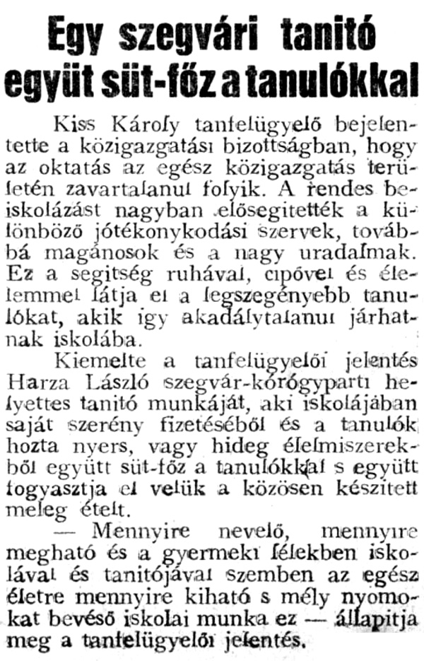 Mlecsenkov László történész-családfakutató „Profi Családfa” Facebook oldalán jelent meg az alábbi érdekes bejegyzés Harza László tanító missziójáról egy szegvári tanyasi iskolában.