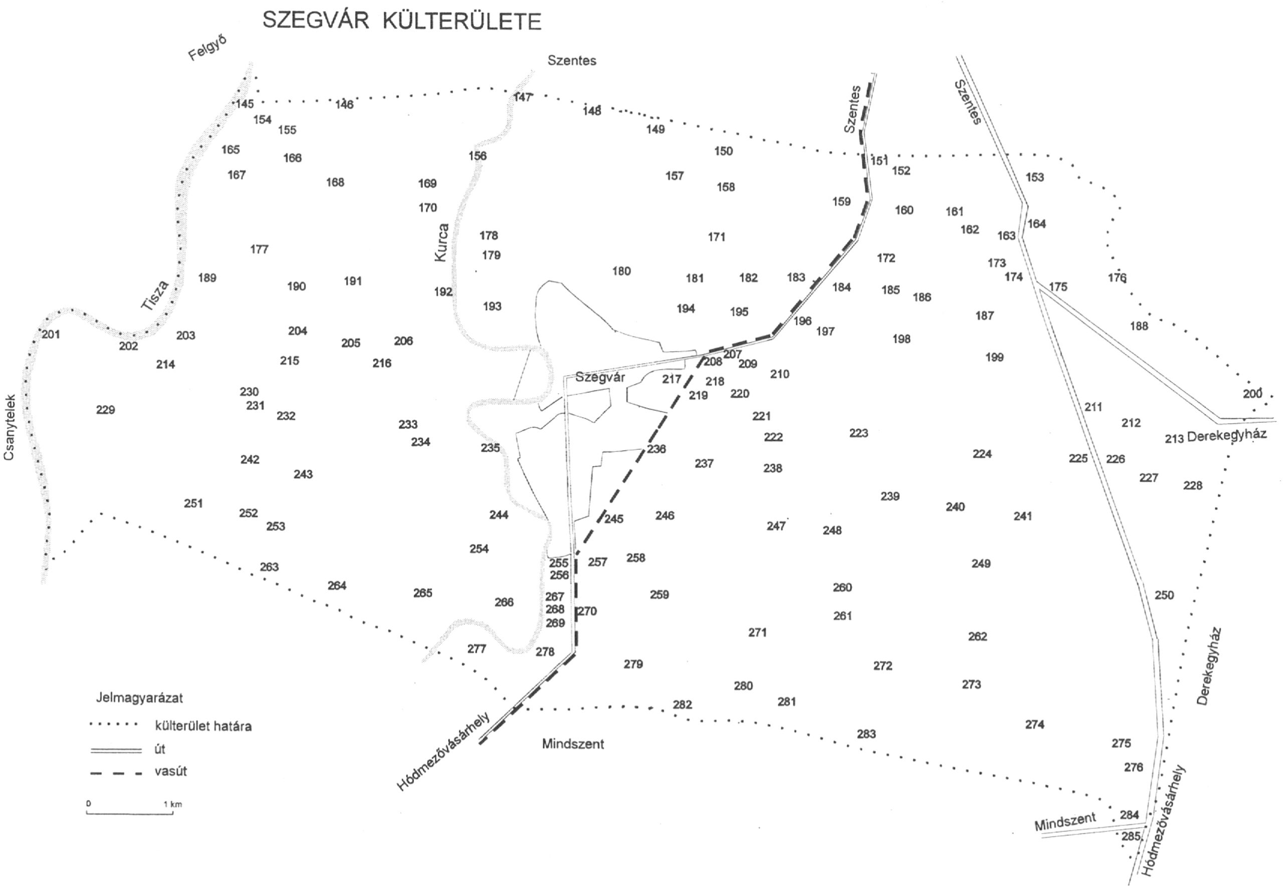 Természetesen Szegváron és másutt (pl. a Csong rád Megyei Levéltárban) kerestem a község kataszteri térképét is, de egyik helyen sem találtam meg, s így végül a Csongrád Megyei Földhivatalban annak a térképnek a másolatáról írtam ki a helyneveket, amely 1965-ben készült. A róla följegyzett adatokat K. rövidítéssel soroltam a címszóként álló népi nevekhez.
